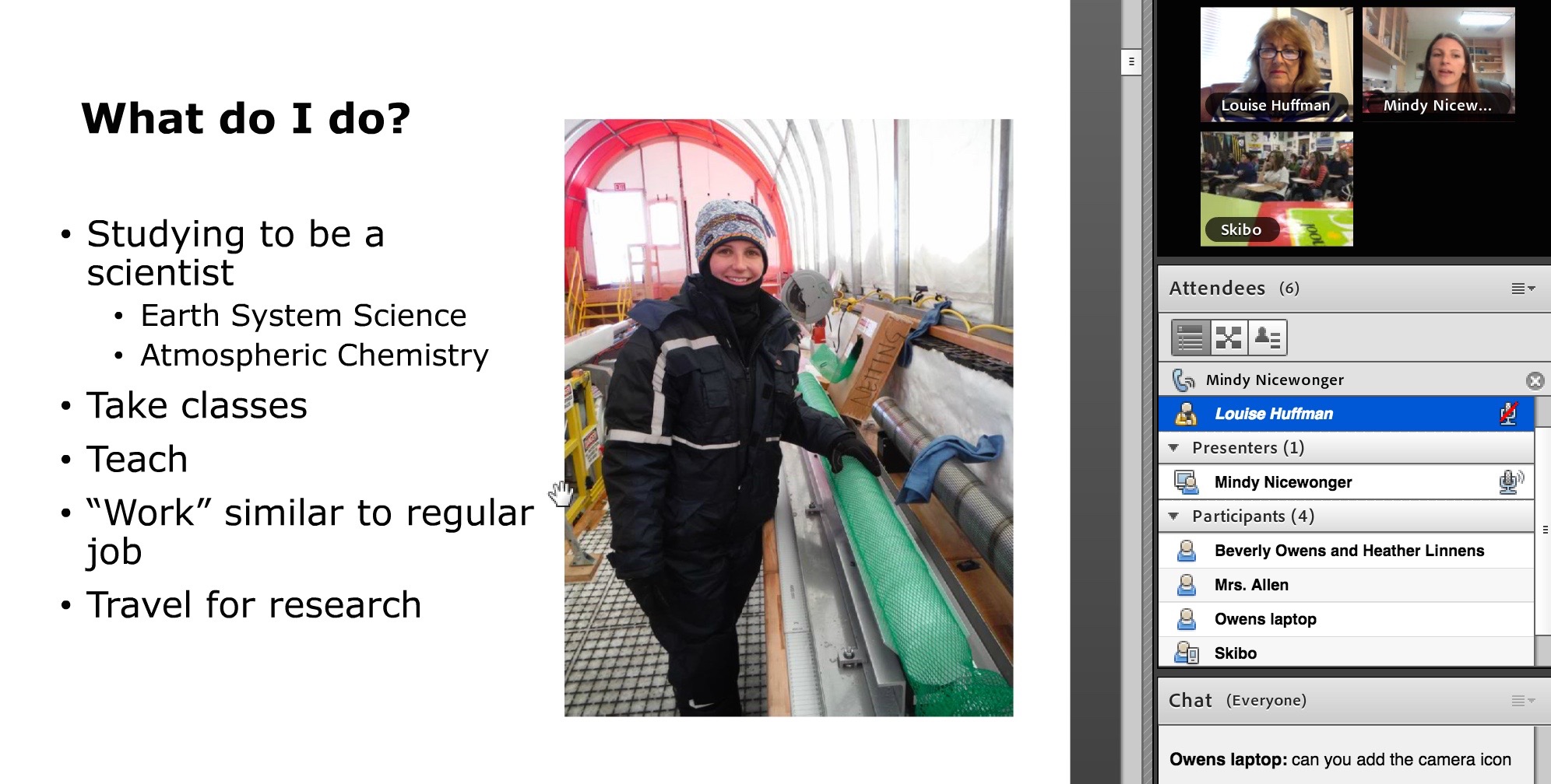 Educators are invited through IDPO's www.climate-expeditions.org to take part in an activity entitled "Checking Out Your Team" which brings IDPO scientists to classrooms through an IDPO webinar. On March 16, Mindy Nicewonger from the South Pole Ice Core drilling project presented ice core research information to 115 North Carolina eighth grade students and four teachers. Louise Huffman, IDPO Director of Education & Public Outreach, led the webinar and worked with the teacher, Beverly Owens, and Mindy to directly align the presentation with eighth grade science standards.