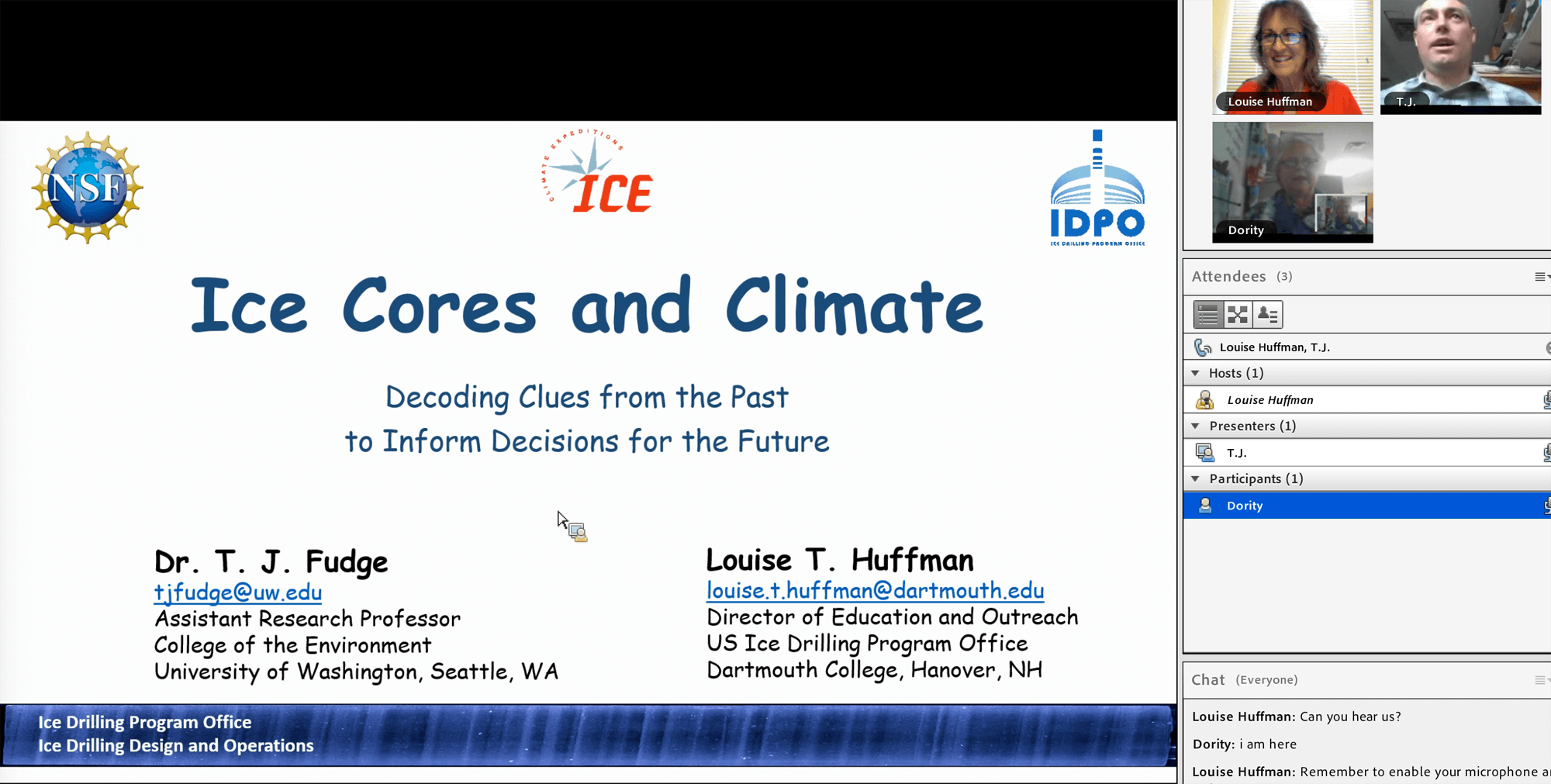 On February 27, Dr. Mary Albert and Louise Huffman presented a Master Class for the Polar Educators International (PEI) webinar series. The Ice Core Science - Using Knowledge to Act webinar explored understanding the evidence of past climate change from polar ice cores as well as adaptation strategies being used by communities already being affected by climate change and how to empower students to take action. Following the webinar, an optional, asynchronous online two-week discussion period about ice core science, climate change, and how to make a student or community action plan began on March 4. You can watch the recorded version of the webinar on the PEI website https://polareducator.org/master-class/ice-core-science/.