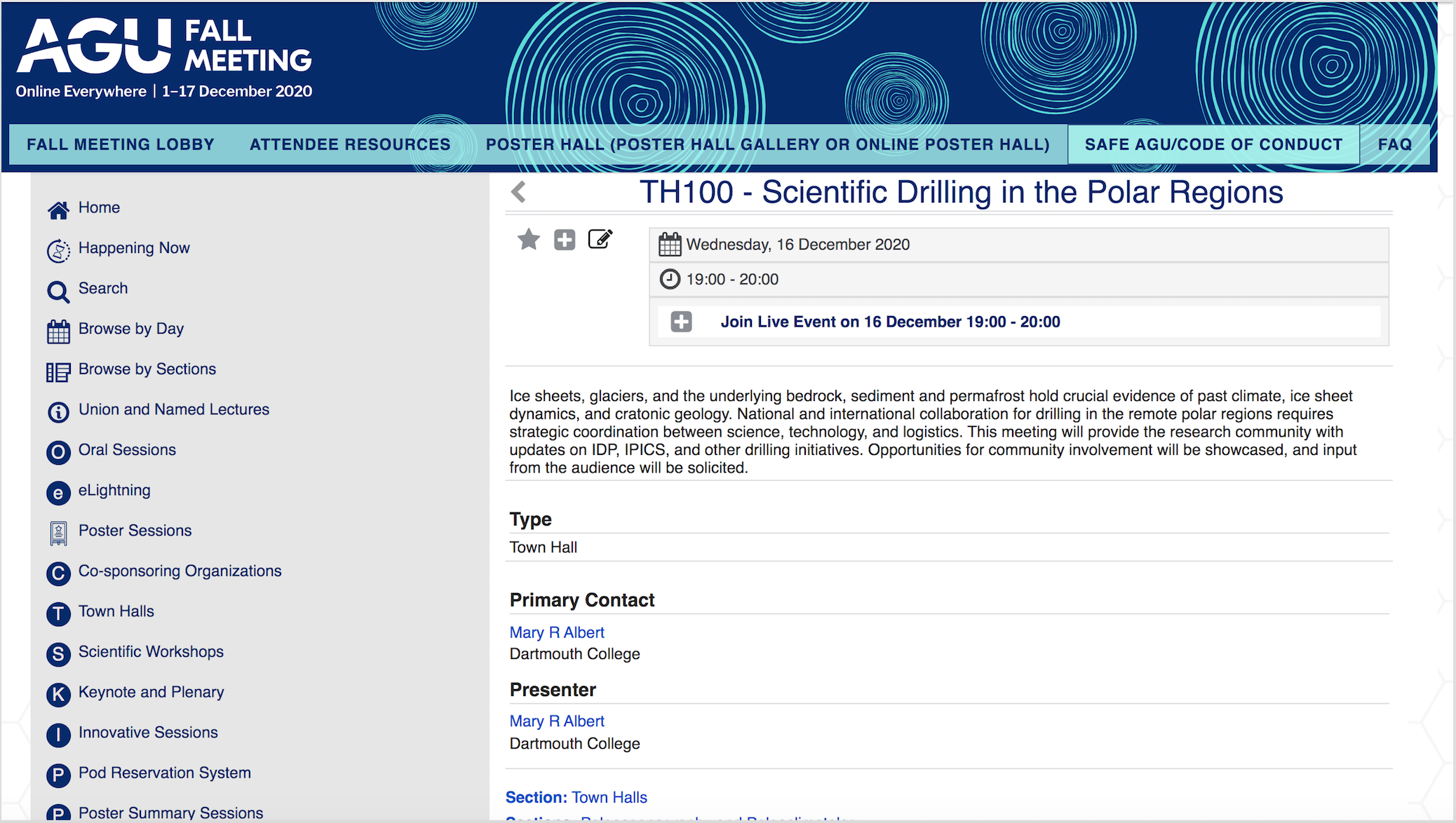 The U.S. Ice Drilling Program (IDP) will hold the AGU Town Hall on Scientific Drilling in the Polar Regions on Wednesday, 16 December 2020, from 16:00-17:00 PACIFIC (19:00-20:00 EASTERN). We hope to see you there!