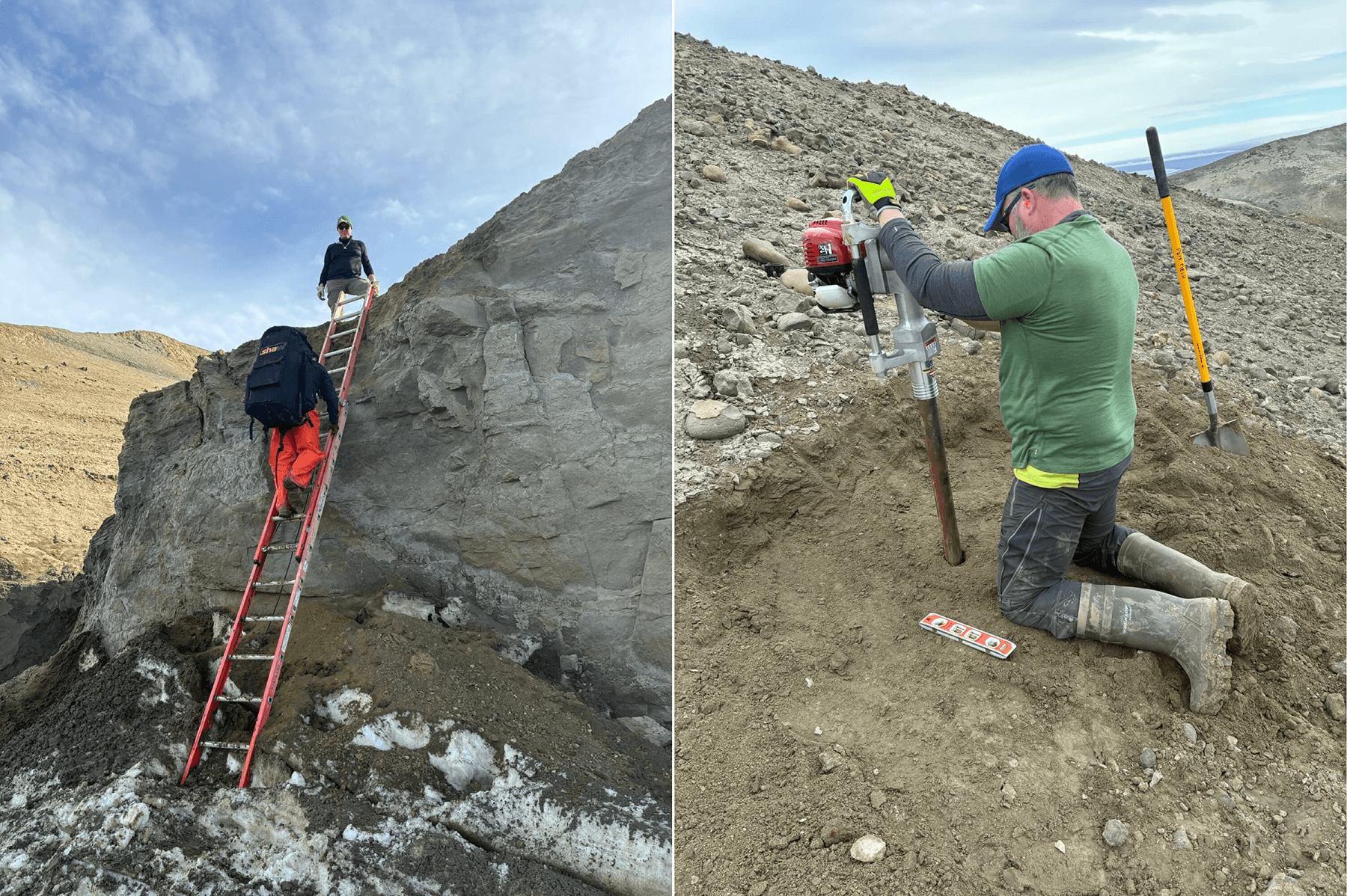 IDP engineers/drillers Tanner Kuhl and Jim Koehler deployed from Punta Arenas, Chile, to Seymour Island via the R/V Sikuliaq (operated by the University of Alaska – Fairbanks) to support the G-296-N Coring Seymour Island project (PI Dr. Thomas Tobin). The field site was too muddy to camp, so the team commuted back and forth to the R/V Sikuliaq. Using a PI-owned Shaw Drill, along with equipment supplied by IDP (electric driver, casings, recirculation basin, water pumps, etc.), the team drilled four boreholes 10- to 15-feet deep each in rock/sediment along a short transect of the island. Reasonably good, mostly continuous core was recovered from all holes. IDP learned a lot about clay and permafrost coring, and the scientists were very happy with the recovered cores.
