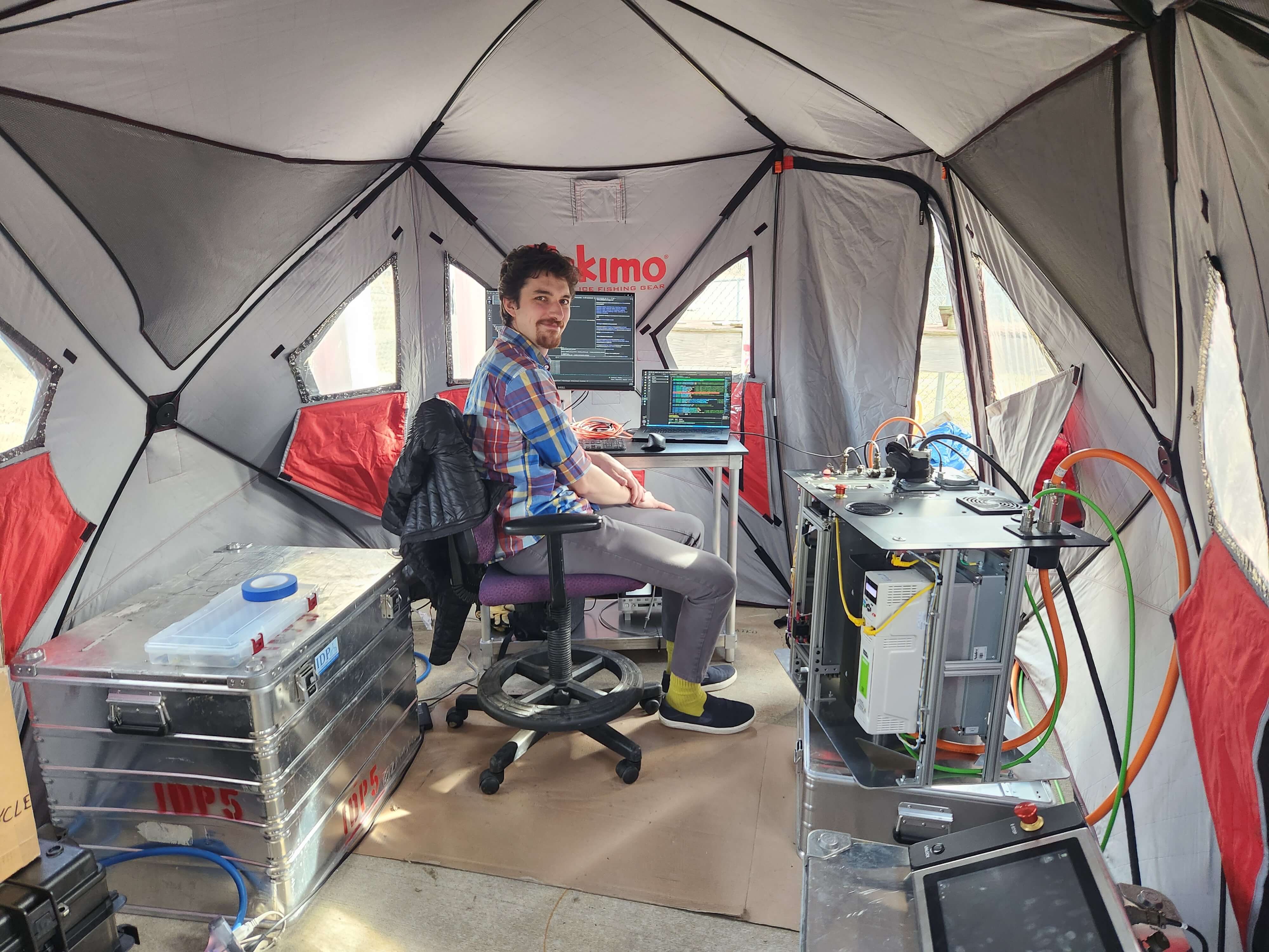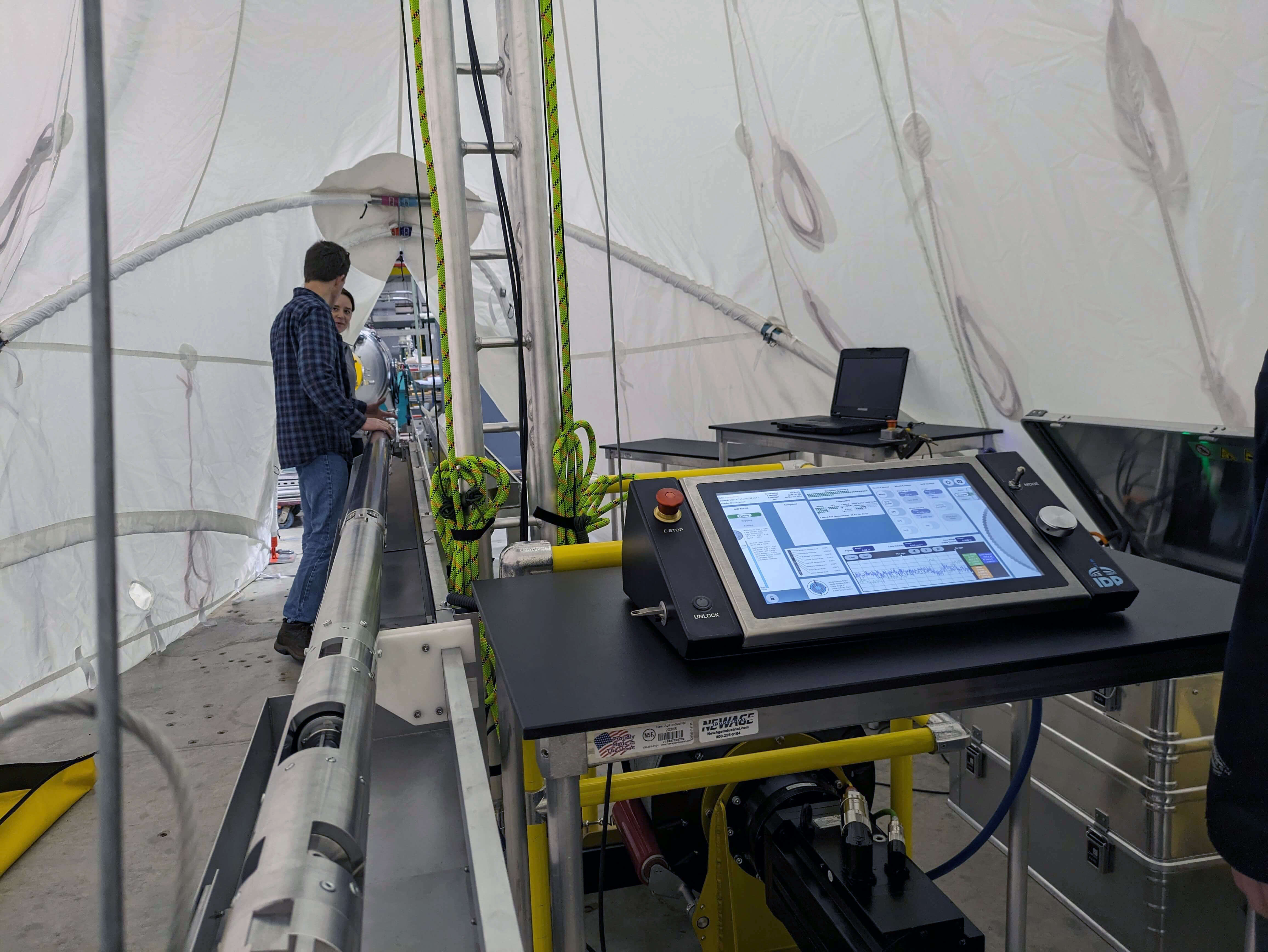 In February and March, IDP engineers spent some time at the UW-Madison Physical Sciences Lab (PSL), putting the 700 Drill winch and control system through its paces. The winch and tower were set up over a cased hole in the ground, and a portion of the drill sonde and a weight were attached to the cable. IDP Electrical Engineer Umberto Stefanini spent several days inside an Eskimo work tent working to test and troubleshoot the control system. Following the outdoor testing, the drill tent was set up inside an adjacent facility at PSL. In April, the drill was set up at the IDP facility to facilitate final in-house testing of the control software, slide rail assembly for laying the drill down, and the core handling and chips/fluid handling trays and assemblies. The drill was disassembled in late April, and packing began for shipment to Scotia, NY, in early May. The drill will be tested and used at Summit Station in June and July to support PI Eric Saltzman’s project.