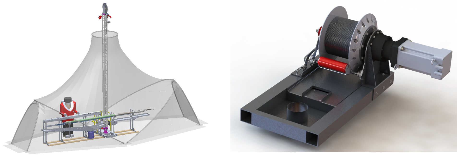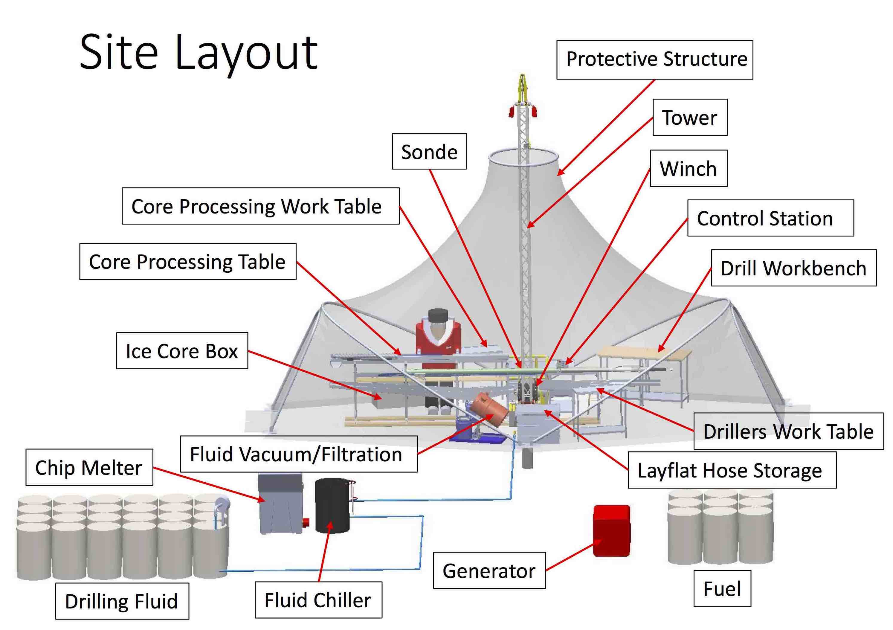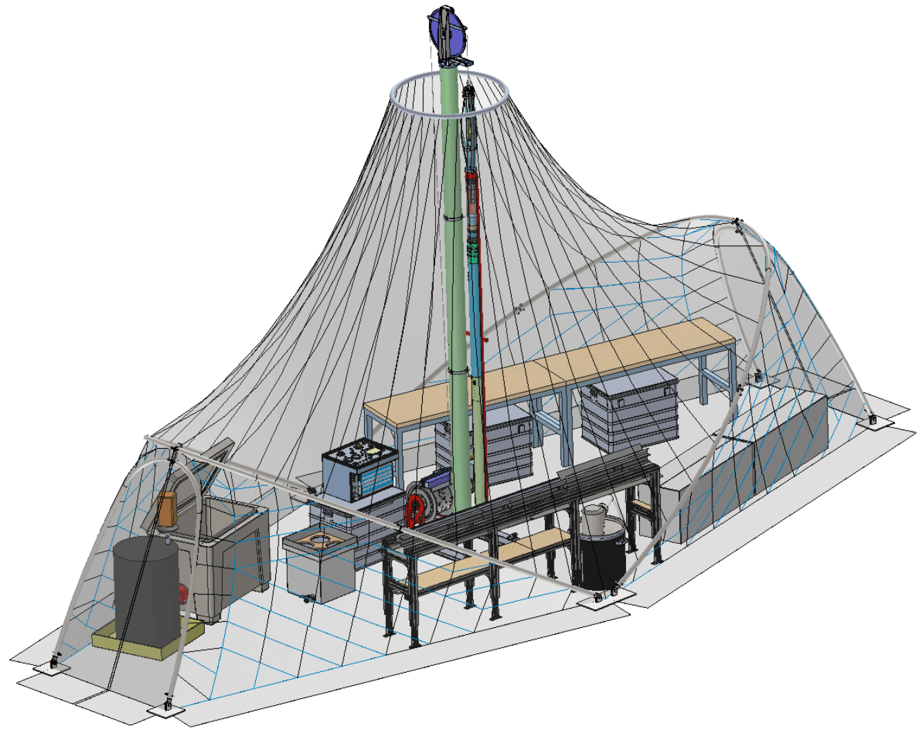 In preparation for the Detailed Design Review of the 700 Drill held on November 18, IDP engineers set up the Foro 400 Drill tent. The team believes a tent of very similar design could be used with the new drill slated to drill to 700 meters if fabrication is approved. A preliminary model of the 700 Drill subsystems can be seen below.