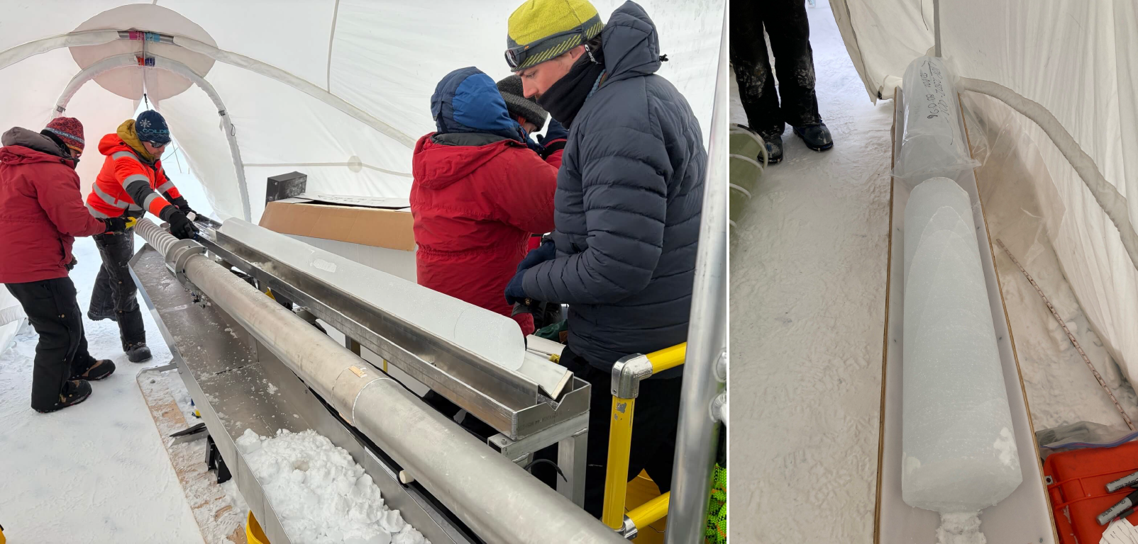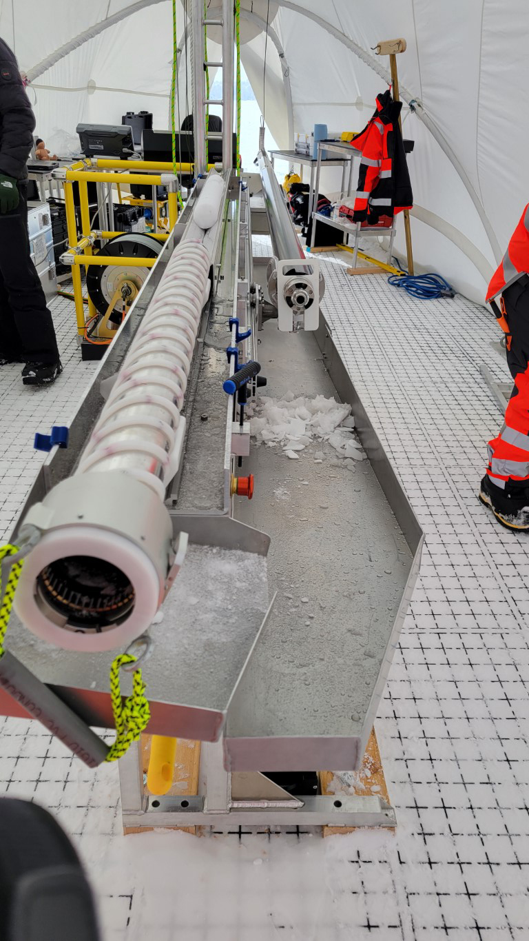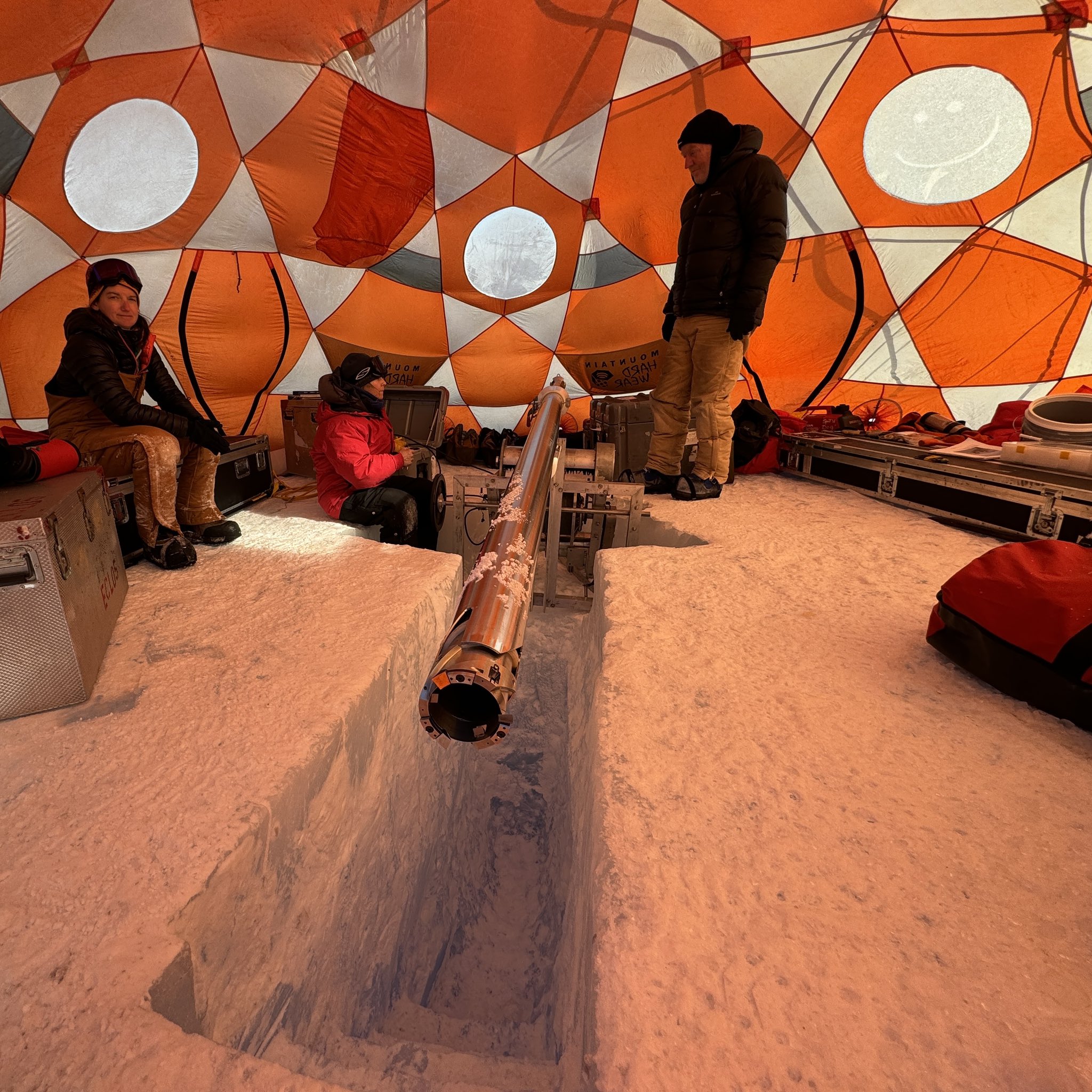At Dome C in East Antarctica, IDP engineer/driller Jay Johnson used the 4-Inch Drill to support the I-159-E project (PI Vas Petrenko). The drilling goal was to complete one 300-meter-deep core near Concordia Station. Drilling began on November 19, 2024, and finished on January 5, 2025. Over the seven weeks, two cores were drilled with the 4-Inch Drill, one to 302.5 meters and a second to 195 meters, surpassing the drilling goal for the season. The drilling was conducted in temperatures that averaged -25°C to - 30°C with -30°C to -40°C wind chills. The project is a collaboration between the US National Science Foundation and the French Polar Institute, who also collected two ice cores using their own drill. The researchers are measuring in situ cosmogenic carbon-14 of carbon monoxide (14CO) and carbon-14 of methane (14CH4).