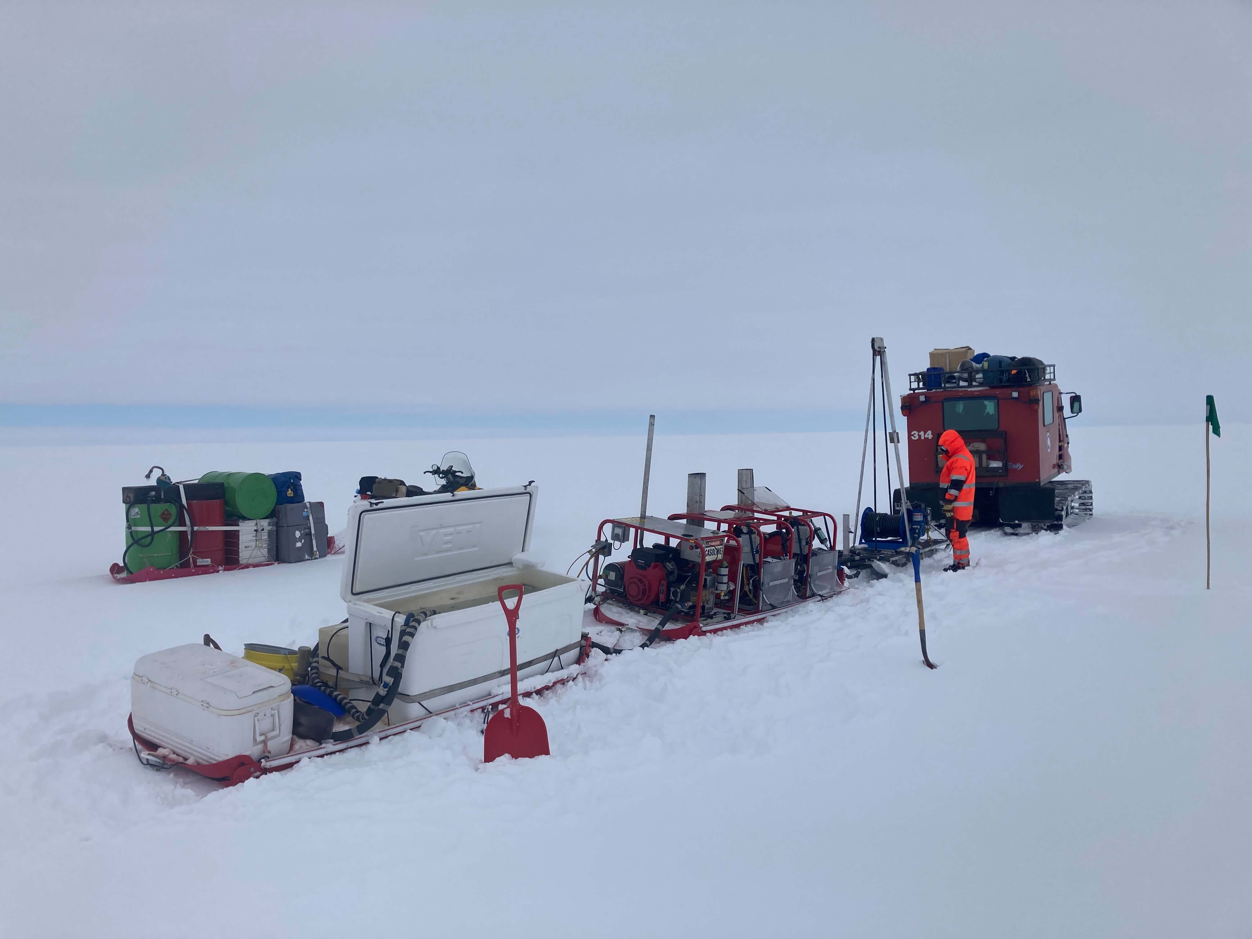 (4) The Sea-Ice Snow Microbial Communities’ Impact on Antarctic Bromocarbon Budgets and Processes project (PI Karen Junge; NSF award 2031121; B-321-M) will test if bromocarbons in sea ice are produced and degraded by microalgae and bacteria found in sea ice, snow, and the interface between the two. The researchers will use a Kovacs Hand Auger to drill several cores (up to 24) through ~2.5 meters of sea ice twice per week for six weeks. The cores will be used to collect chemical and biological measurements of sea ice and snow to determine bromocarbon concentrations, microbial activity associated with them, and intra-cellular genes and proteins involved in bromocarbon metabolism. Bromocarbons are known to contribute to stratospheric ozone depletion over Antarctica. This project will test if they are produced and degraded by algae and bacteria found in sea ice, snow, and the interface between the two.