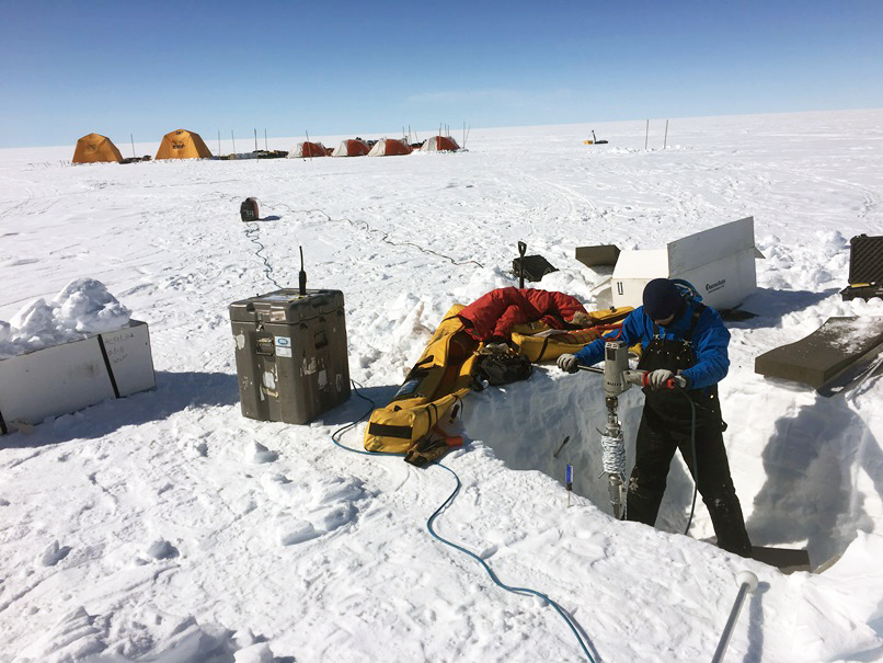 (3) The NSF-NERC: Ground Geophysics Survey of Thwaites Glacier project (PI Sridhar Anandakrishnan; NSF award 1738934) contributes to the joint initiative launched by the U.S. National Science Foundation (NSF) and the U.K. Natural Environment Research Council (NERC) to substantially improve decadal and longer-term projections of ice loss and sea-level rise originating from Thwaites Glacier in West Antarctica. The project’s objectives are to learn whether basal conditions allow for rapid retreat of the Thwaites Glacier grounding line or whether retreat may re-stabilize near its current grounding line. These objectives will be achieved by using dedicated ice-flow modeling to guide targeted field surveys and experiments over two seasons, and to measure the most important unknown quantities and incorporate them into the models. Numerical models will be used to generate hypotheses for basal conditions that are testable through geophysical surveys and to project future behavior of Thwaites Glacier after assimilating the resulting data. The geophysical methods include seismic, radar, gravity, and electrical surveys that together allow for a fuller bed characterization. The project will conduct field surveys in areas representative of different parts of the glacier, including across the margins, near the grounding line, and along the central axis of the glacier into its catchment. The Rapid Air Movement (RAM) Drill will be used to create the shot holes required for the seismic measurements.